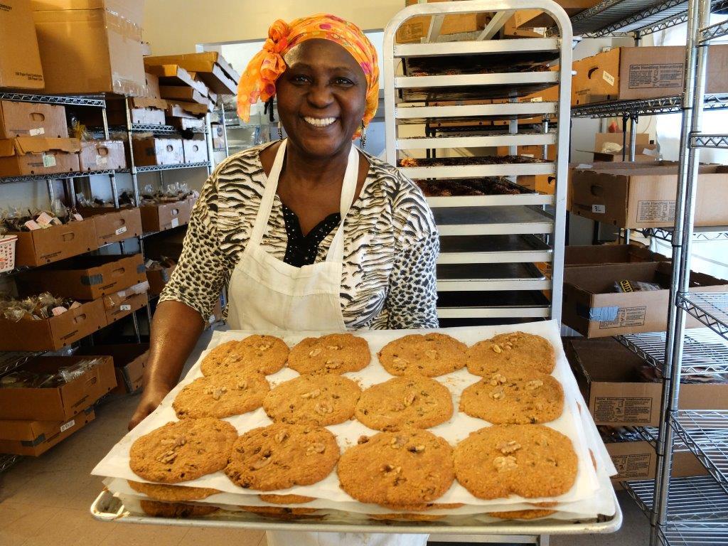 Elizabeth settled in Louisville, Kentucky, where she met her husband, Todd Bartlett, while waitressing at a restaurant. Todd was a cook, and together worked in the new start up Kizito Cookies in 1989. Over the years, the business grew from selling cookies from a basket and pushcart to a full bakery and gift shop on Bardstown Road, producing 14 flavors of cookies, muffins, and granola. Elizabeth’s signature cookies, such as “Lucky in Kentucky” (a mix of white and dark chocolate chips with pecans) have become local favorites, and she continues to sell cookies with care and personal attention, often remembering which flavors her customers prefer.